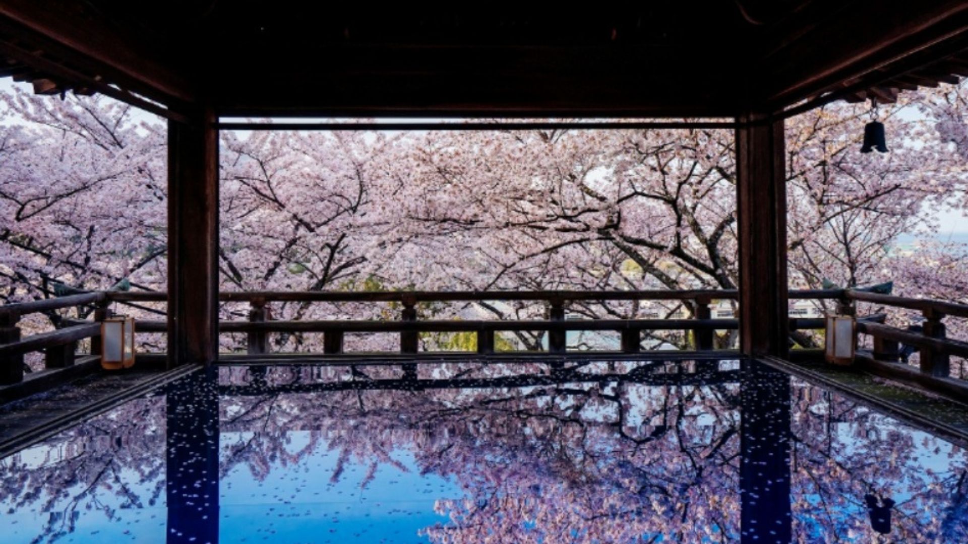 観月舞台に敷いたアクリル板に境内の桜が映り込み、天地に桜が現れる「桜のリフレクション」。6人ずつ約4分の貸切タイムで、幻想的な桜体験を。