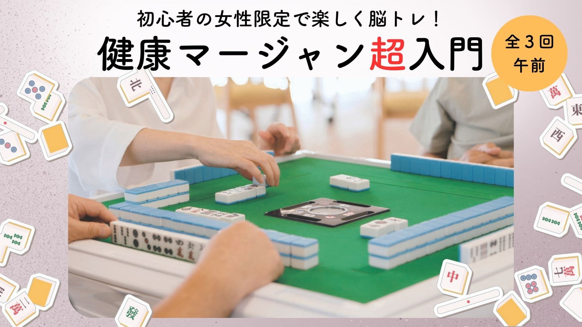 「賭けない、飲まない、吸わない」をモットーに、健全な頭脳スポーツに生まれ変わった健康マージャン。頭を使い手も動かすから脳トレにぴったりで、しかも楽しい! と人気上昇中です。ハルメクでは、初心者の女性同士で安心して学べる入門講座を開催します。ルールが難しそうという方も大丈夫。少人数制で専門資格を持つレッスンプロや競技プロが教えるから、3回楽しむうちに、どこに行っても恥ずかしくないマージャンのルールとマナーが身に付きます。