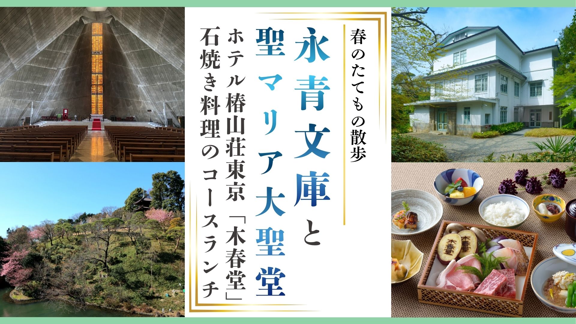東京カテドラル聖マリア大聖堂では荘厳な空間に包まれます。明治に山縣有朋(やまがた・ありとも)が作庭した椿山荘庭園は高低差が特徴的な日本庭園です。