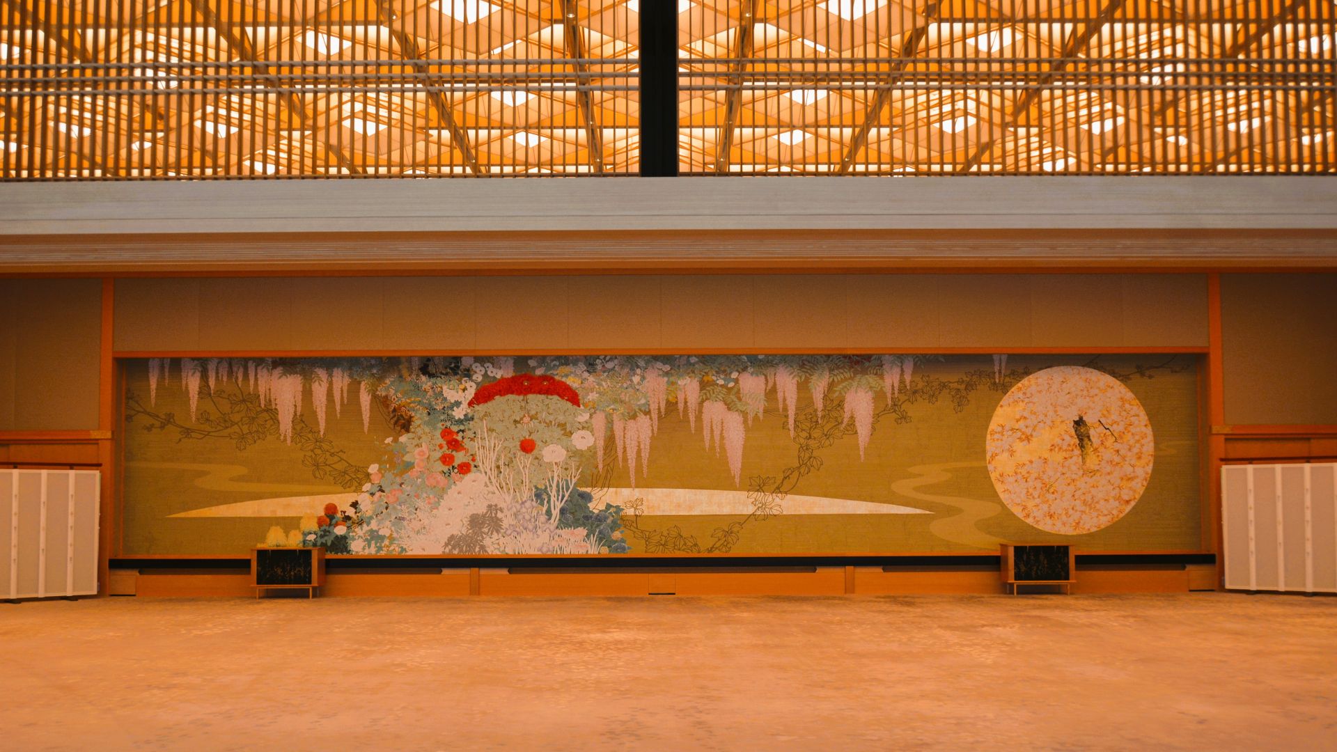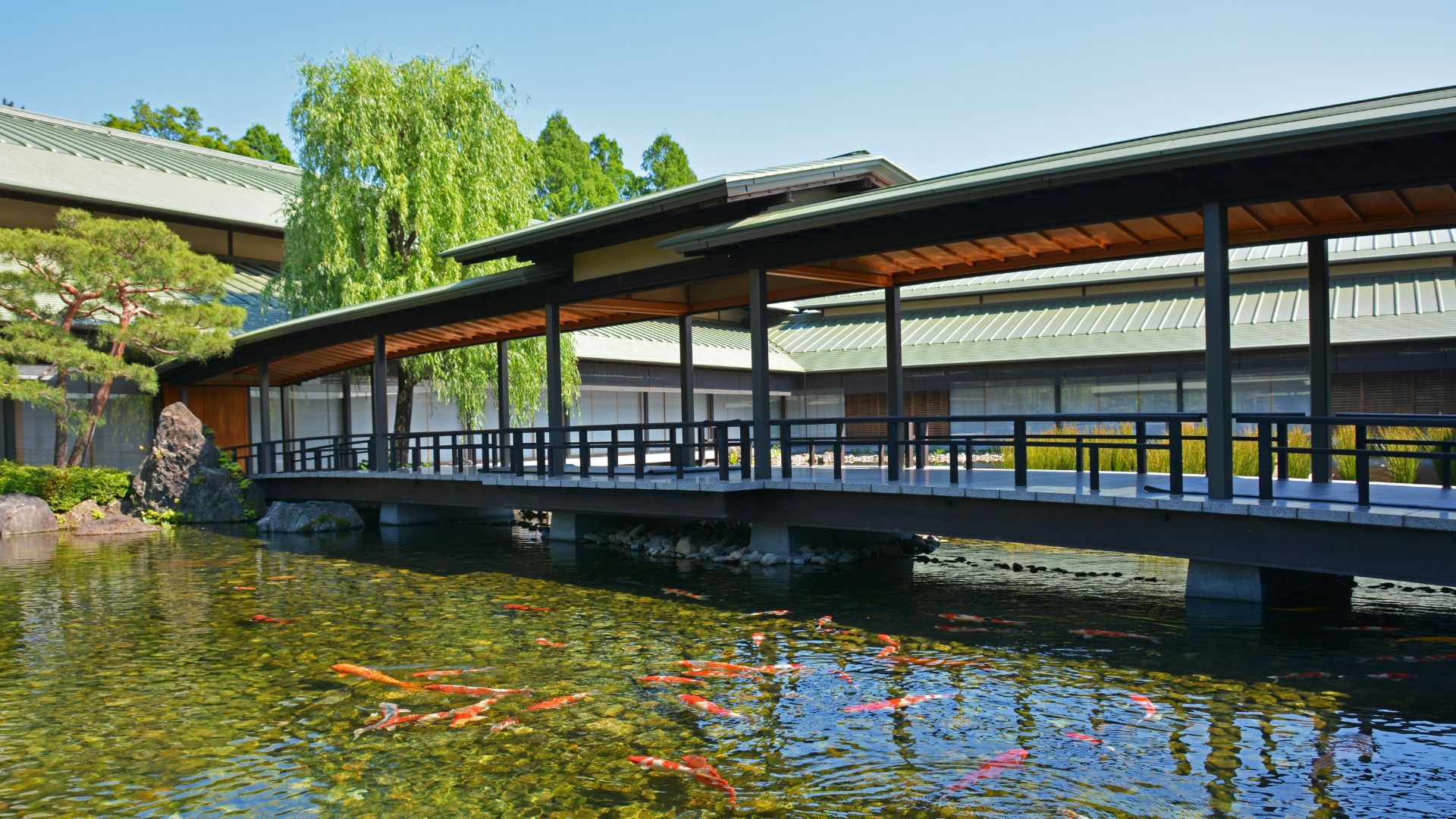2005(平成17)年に開館した国の迎賓施設。入母屋(いりもや)屋根と数寄屋(すきや)造りの外観で、品格のある和風の佇まい。調度品には、西陣織や蒔絵、漆など、日本を代表する匠の技が用いられています。
