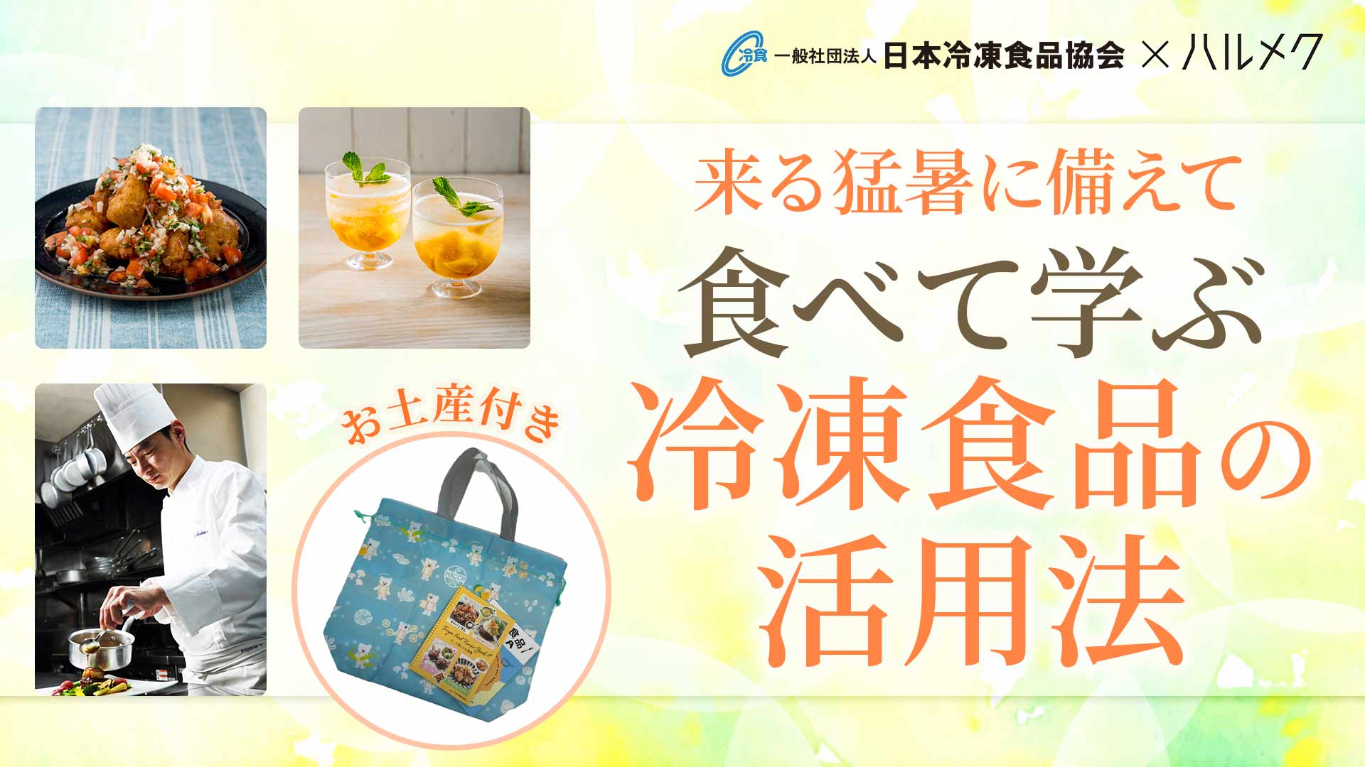 今年の夏も危険なほどの暑さが心配されます。夏バテ予防に食事は大切。でも暑い中作るのは大変……そんなときは冷凍食品が助けになります! この講座では、冷凍食品を活用した夏においしく、栄養バランスがよく、時短でできる簡単メニューを実食。ミニセミナーで便利で楽しい冷凍食品について学べます。日本冷凍食品協会からのお土産付き! 夏に活躍する保冷バッグなどオリジナルグッズを参加者全員にプレゼントします。