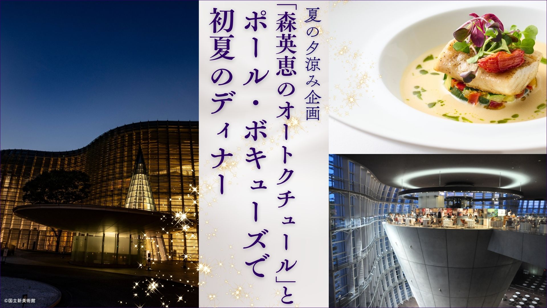 「火加減、塩加減、素材」という基本を極めた料理は芸術の域に達していると評価されているフレンチの名店「ポール・ボキューズ」。本イベントでは国立新美術館内の巨大なアトリウムにそびえる「逆円錐(コーン)」、その上に構える「ブラッスリー ポール・ボキューズ ミュゼ」で初夏のディナーをご堪能いただきます。近未来的な空間にフレンチという取り合わせが新鮮です。