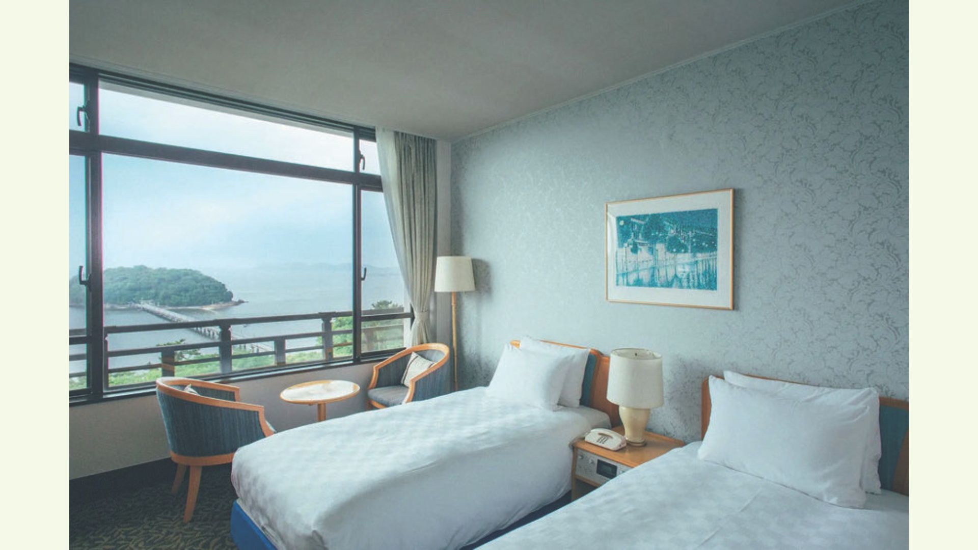 三河湾を望む海側客室に宿泊。大きな窓から日が差し込む明るいお部屋です。山側のお部屋に宿泊するプランもあります(旅行代金5,000円引き)。