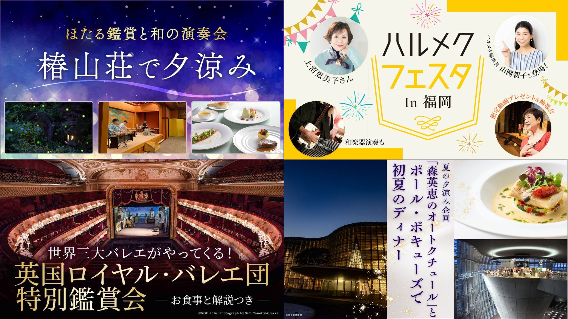 椿山荘で70年以上続く「ほたるの夕べ」をアレンジした、ハルメクだけの納涼イベントを今年も開催します。箏、三味線、尺八の和の音色で夏の曲を聴き、椿山荘洋食シェフのこだわりのフランス料理に舌鼓。アルコールを含むフリードリンク制ですので、お好きなお飲み物を飲みながら和のコンサートを鑑賞できます。